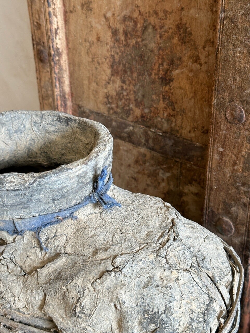 Met zorg uitgekozen, super mooie leemmand met touw en veel ingedroogd leem