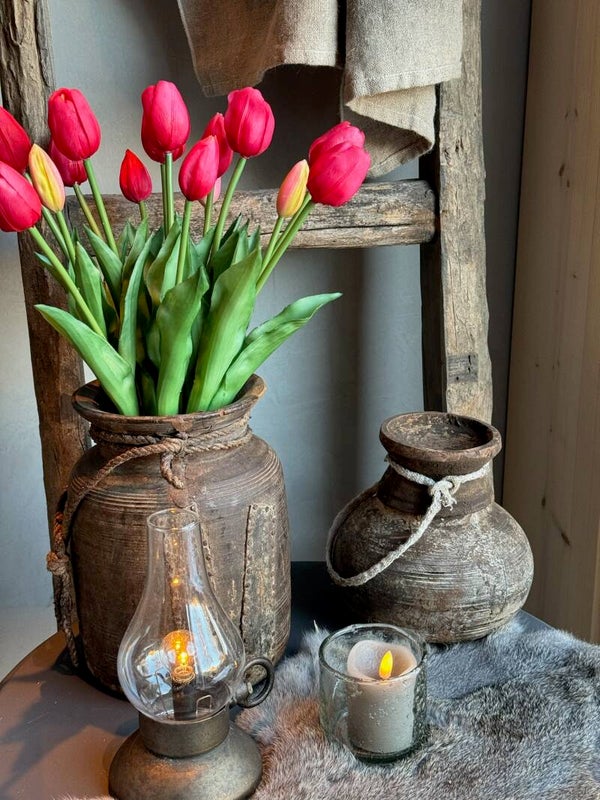 Erg mooi in een stalen emmer, glazen cilinder of zoals op de foto in een houten kruik. Maar deze tulpen kan je ook leuk neerleggen 😉 💐