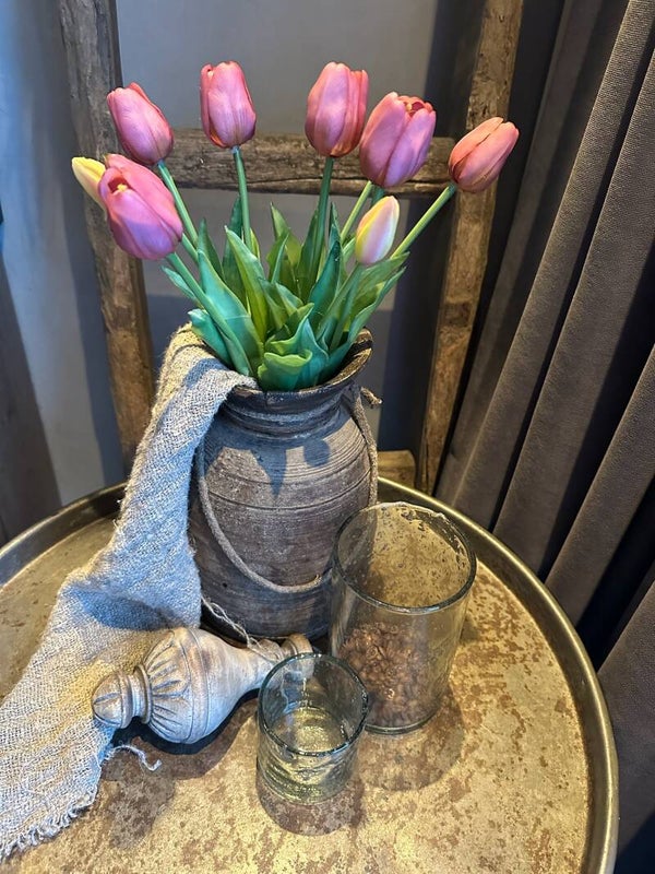 Erg mooi in een stalen emmer, glazen cilinder of zoals op de foto in een houten kruik. Maar deze tulpen kan je ook leuk neerleggen 😉 💐