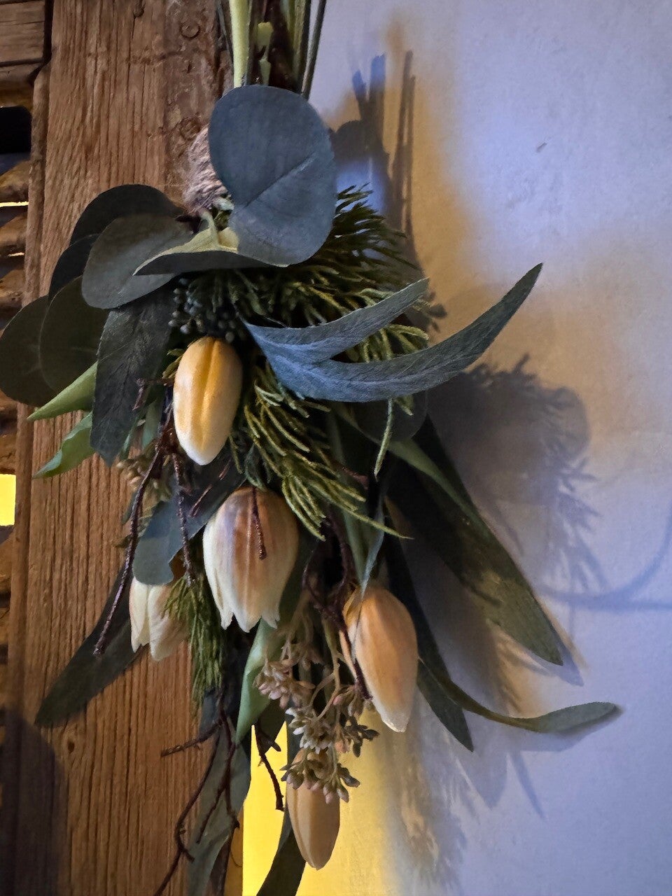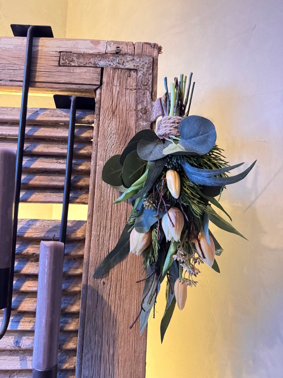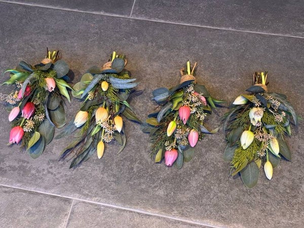 Handgemaakte kunst toef met o.a. tulpen, prunus, berken takjes en diverse soorten eucalyptus, afgebonden met touw en een mooie stevige lus, zo kan je hem mooi ophangen of neerleggen