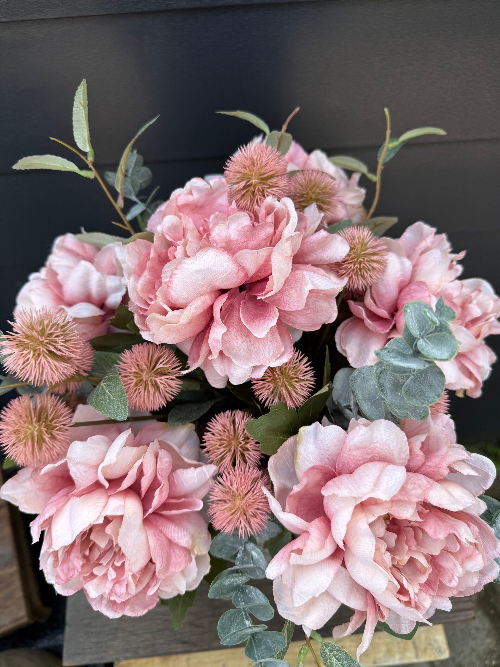 In boeket Jolien zitten de prachtige pioenrozen als eyecatchers in het boeket, veruit de meeste populaire kunstbloem van dit moment! Door zijn prachtige zachte kleur staat dit boeket mooiman elk seizoen!