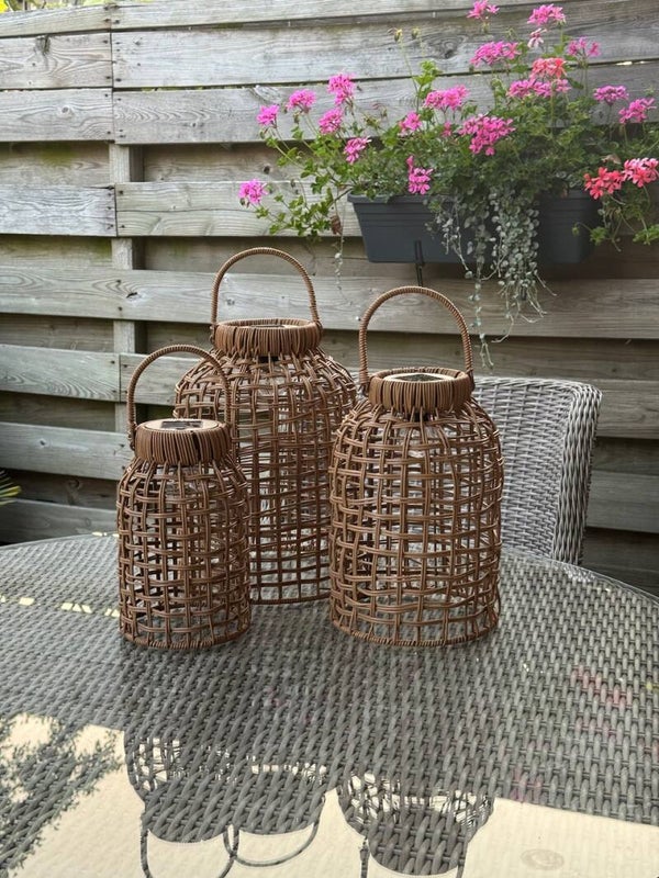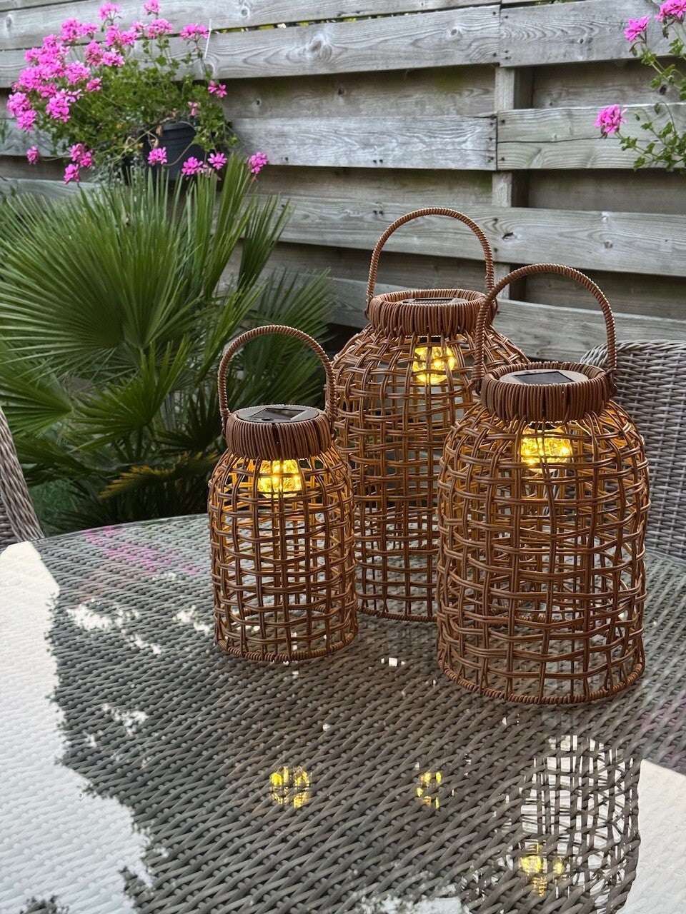 Breng warmte en gezelligheid in je tuin of op je balkon met deze prachtige solar lampen in rotan look. De set bestaat uit drie formaten die perfect met elkaar combineren. Overdag laden ze zichzelf op via het zonnepaneeltje bovenop, en zodra het begint te schemeren, zorgen de warme LED-lichtjes automatisch voor een knusse sfeer.