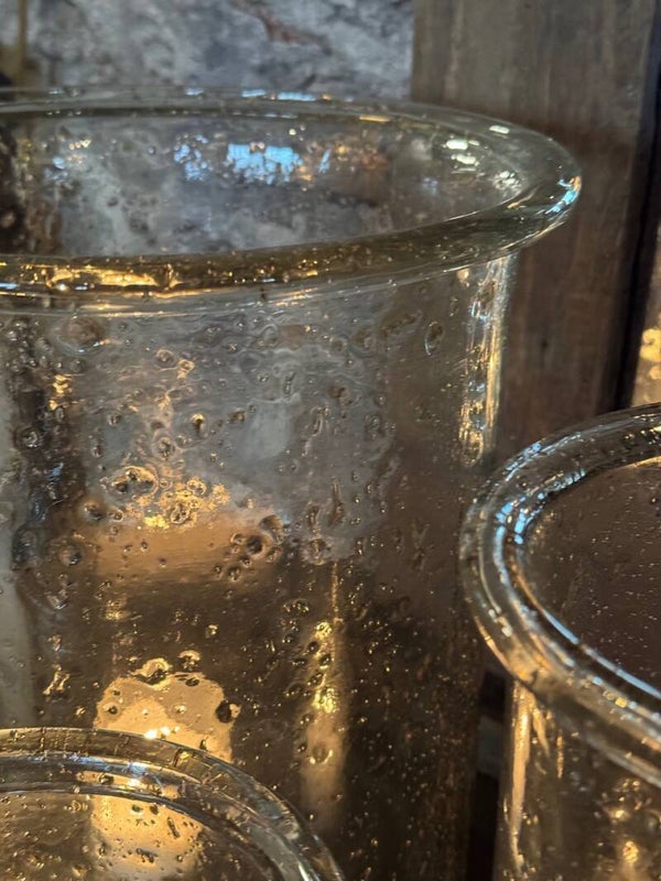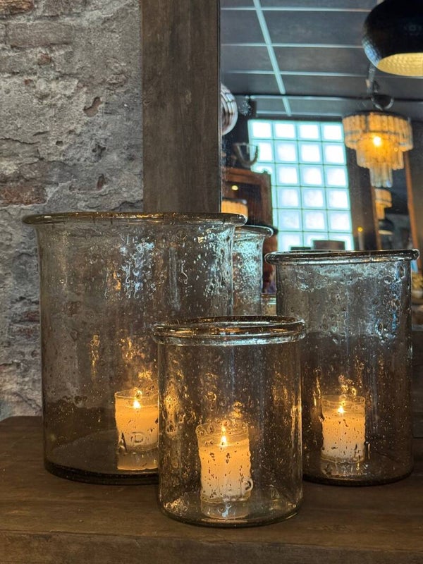 De nieuwe collectie windlichten van Aura Peeperkorn, prachtig met de hand mondgeblazen en afgewerkt met een unieke rand. Elk model en formaat heeft zijn eigen charme, waardoor je telkens weer een ander sfeervol effect in huis haalt.